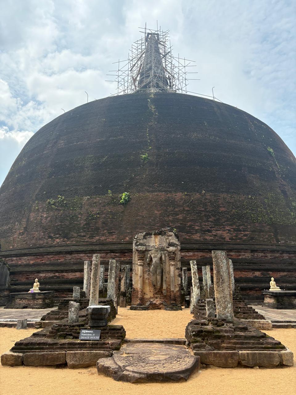De las muchas “estupas” (o “dagobas”, como se conoce aquí a estos monumentos funerarios budistas) que vi en Sri Lanka, y que de verdad fueron muchas, la de Rankoth Vehera fue la que más me impresionó, tal vez por su tamaño o por las tantas vueltas que di a su alrededor en busca del buen karma… o porque es toda de ladrillo, lo que le da un tono único, o por el sitio mismo donde se encuentra, en la milenaria ciudadela sagrada de Polonnaruwa, antigua capital de Sri Lanka, hoy sitio arqueológico sensacional.