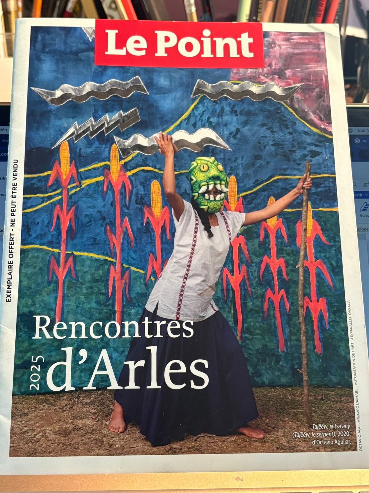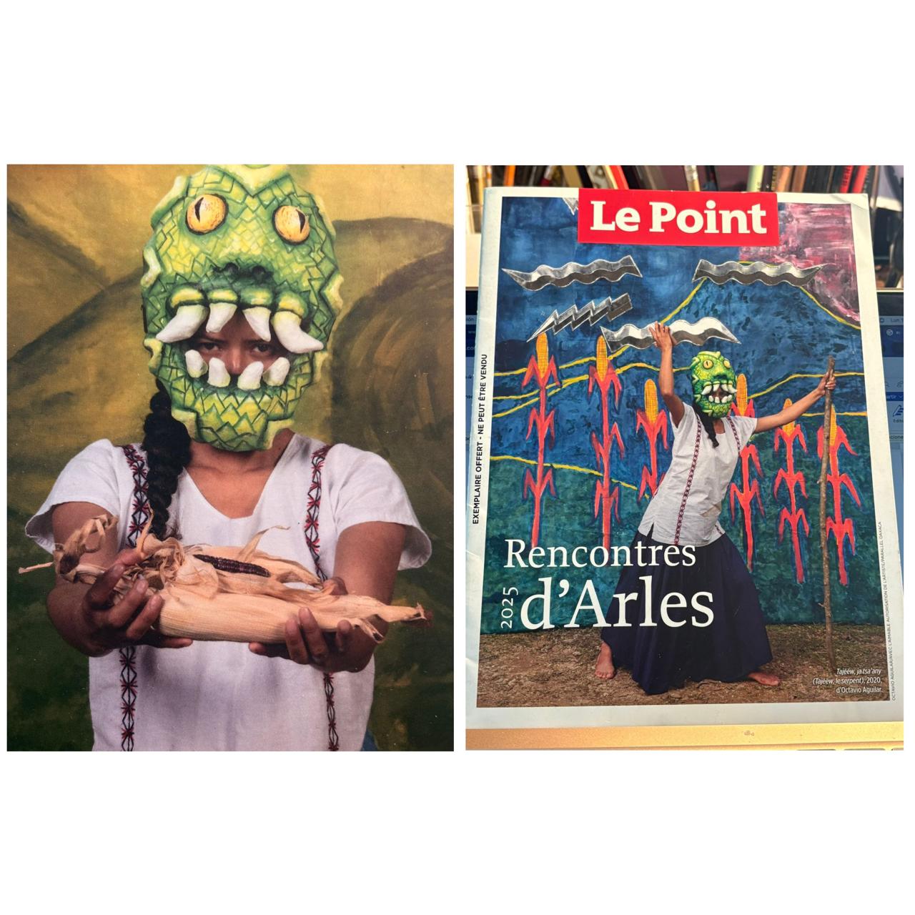 De eso, de identidad y memoria, trata su instalación audiovisual, titulada Tajëëw y Kontoy, nombres de dos antiguos del pueblo ayuuk, nombre que los mixes dan a su propia lengua y cultura. Cuentos y leyendas, transmitidos oralmente a Octavio por su abuela, Áurea. Figuras de (súper) héroes enmascarados, provenientes de mitos prehispánicos, que él recupera a su personal manera; un estilo y una temática tan llamativos que el conocido semanario Le Point utilizó una foto titulada “Tajëëw” (La serpiente) como portada de su suplemento especial sobre Les Rencontres d’ Arlés 2025.