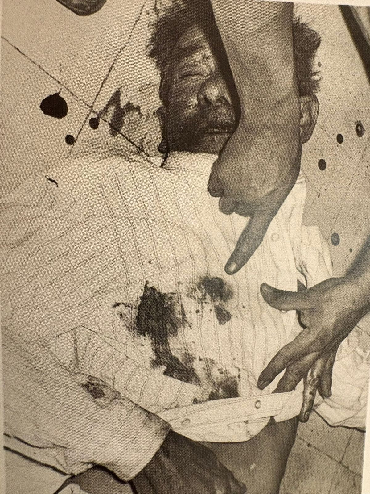En todas las imágenes figura un dedo índice que señala hacia un hecho de sangre, el sitio de un crimen, un cuerpo balaceado, dos presuntos delincuentes… Cada espectador interpreta la historia, y se proyecta, detrás de cada una de estas imágenes terribles, un juego de storytelling al que nos somete Fontcuberta, con esos dedos que apuntan, para este visitante, hacia la realidad de un México sangrante, siempre tan violento, un país, en efecto, de nota roja.