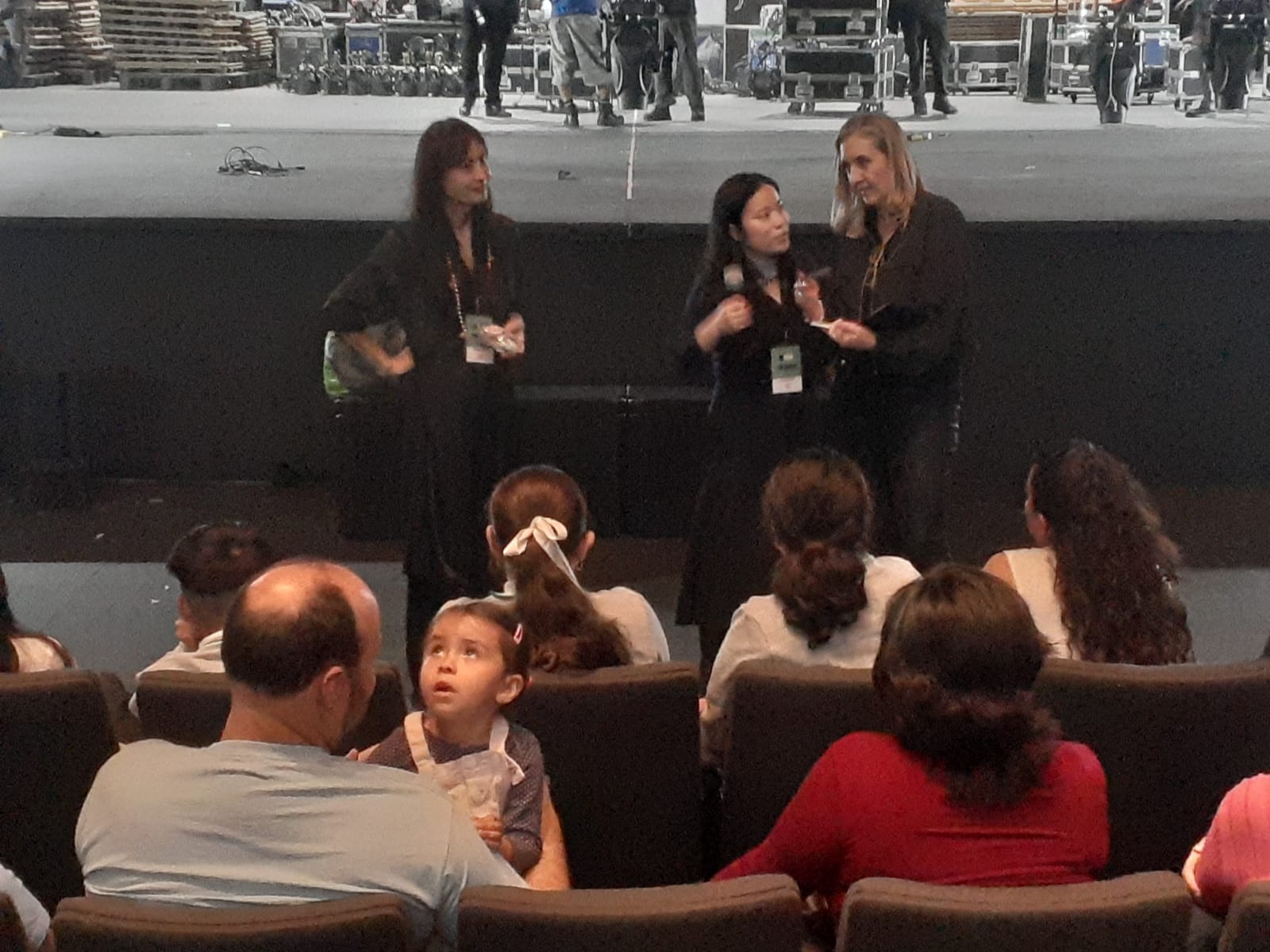La directora de Jajack Movement, la coreógrafa surcoreana Yumi Kim, reparte flores de cerezo a las niñas que acudieron a su conversatorio en el Auditorio del estado de Guanajuato, mientras a sus espaldas se monta la escenografía de Samsara of Blossom, obra sobre los ciclos de la vida, para traer el pasado al presente.