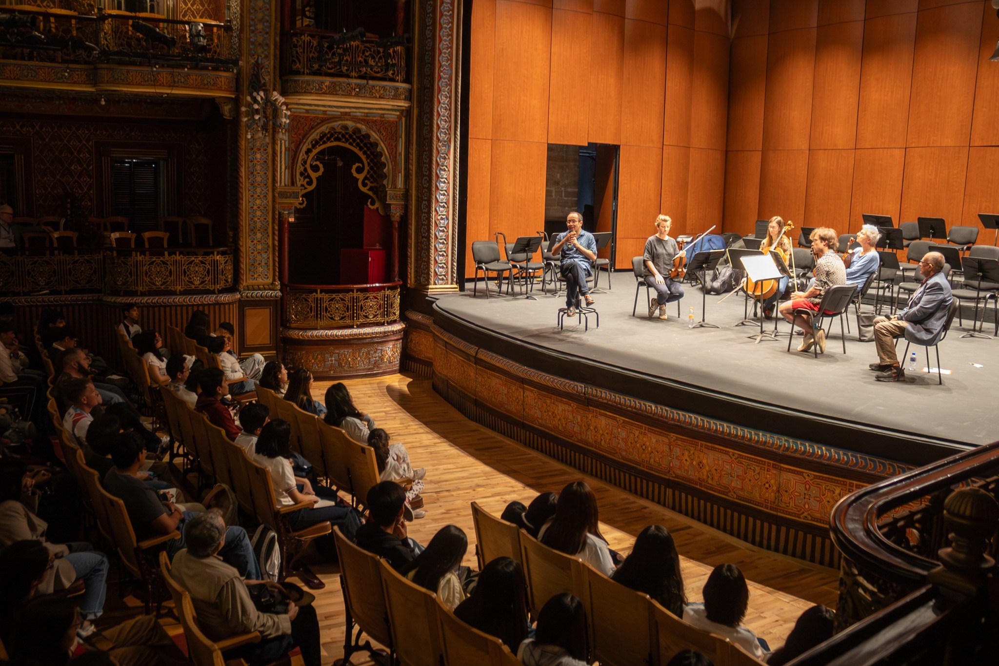 Incluso fue tolerante con el público que asistió la noche del martes 14 de octubre al majestuoso Teatro Juárez, uno de los más hermosos y fascinantes del país, que aplaudía entre los movimientos de cada pieza, aunque en la entrevista con Fusilerías contaba divertido que en algún concierto en que estuvo en Brasil la gente aplaudía incluso después de cada solo.