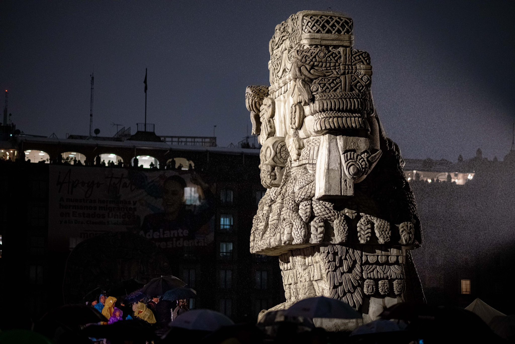 En los alrededores de la plancha se colocaron réplicas de las esculturas Coatlicue, Coyolxauhqui, el Teocalli de la Guerra Sagrada, la Piedra del Sol y Tlaltecuhtli. La presencia de estos íconos prehispánicos completó la atmósfera de memoria viva, conectando el presente urbano con la cosmovisión ancestral que aún habita el territorio.